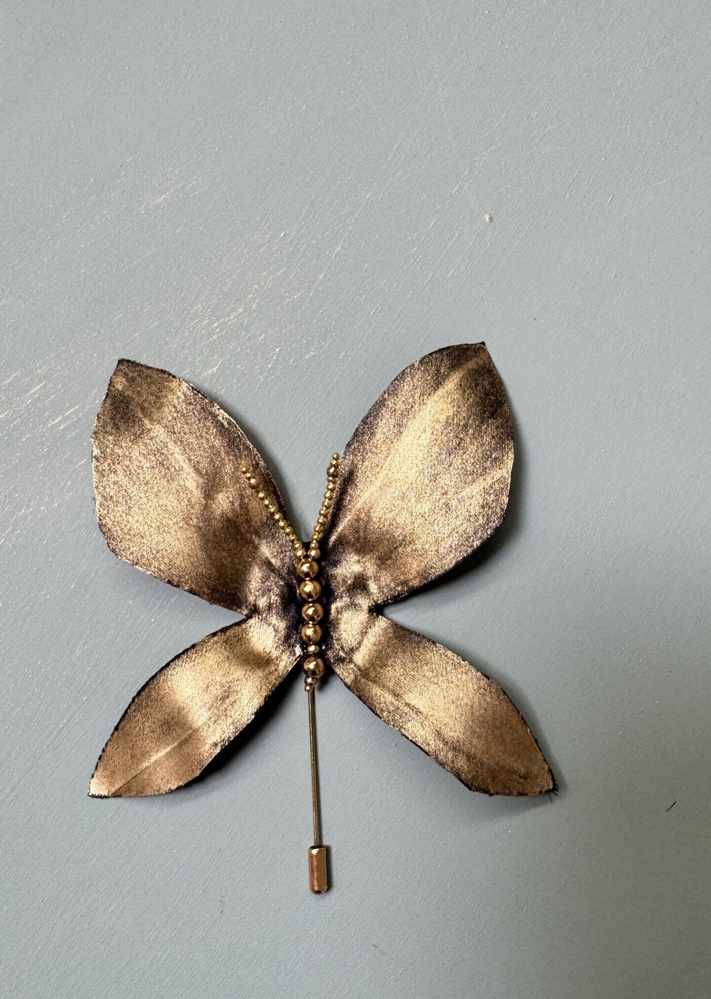 Handgefertigte Schmetterling Brosche aus verstärkter Seide mit goldener Veredelung. Leicht, elegant und formstabil. Ein feiner Akzent für Blazer, Mantel oder Kleid.