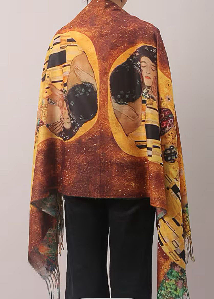Der Schal Golden Muse ist ein leichter, langer Schal, inspiriert von der Ästhetik des Jugendstils und der Porträtmalerei. Die goldene Farbpalette und das ausdrucksstarke Motiv machen ihn zu einem markanten Akzent, der dennoch alltagstauglich bleibt.