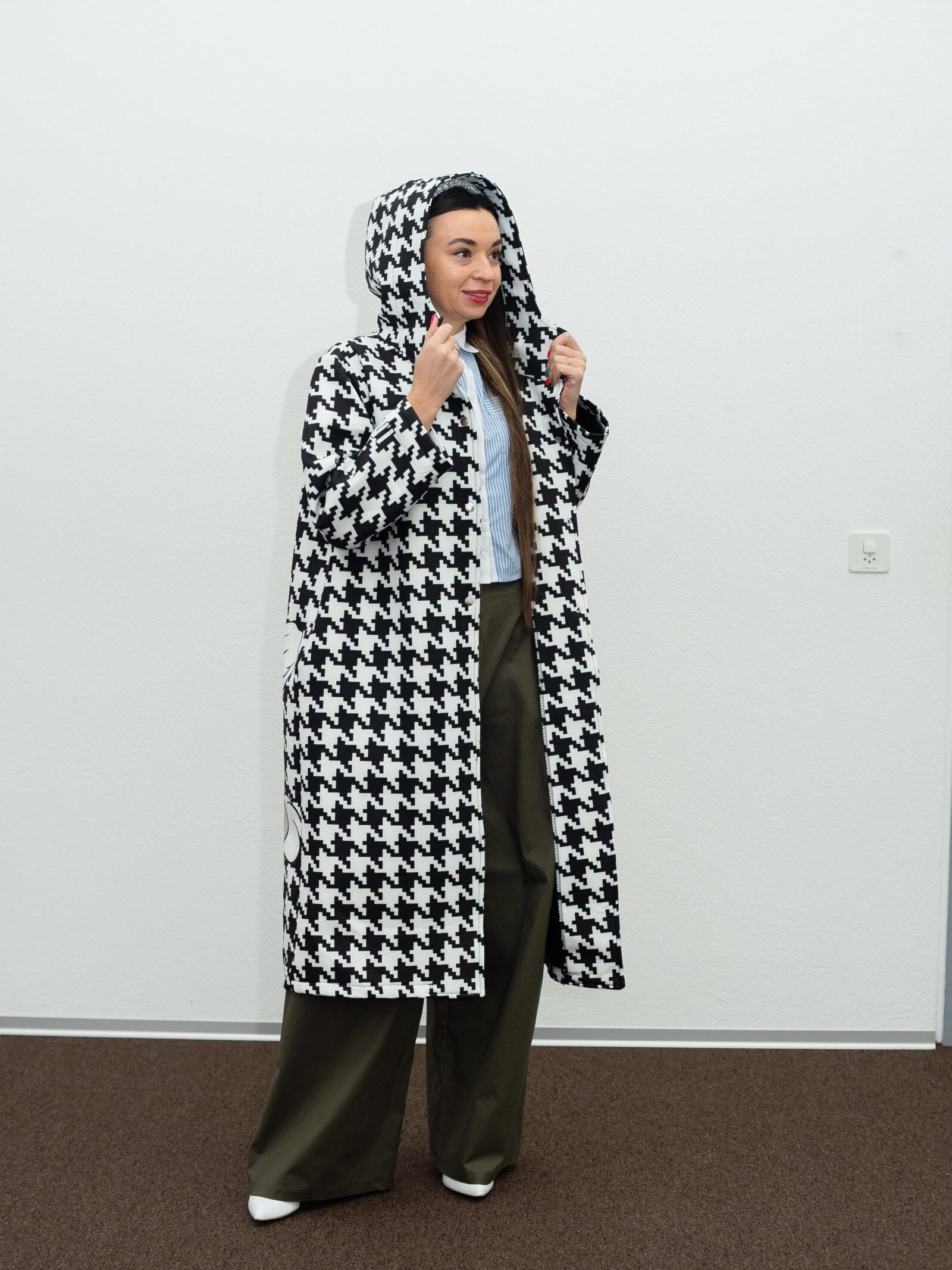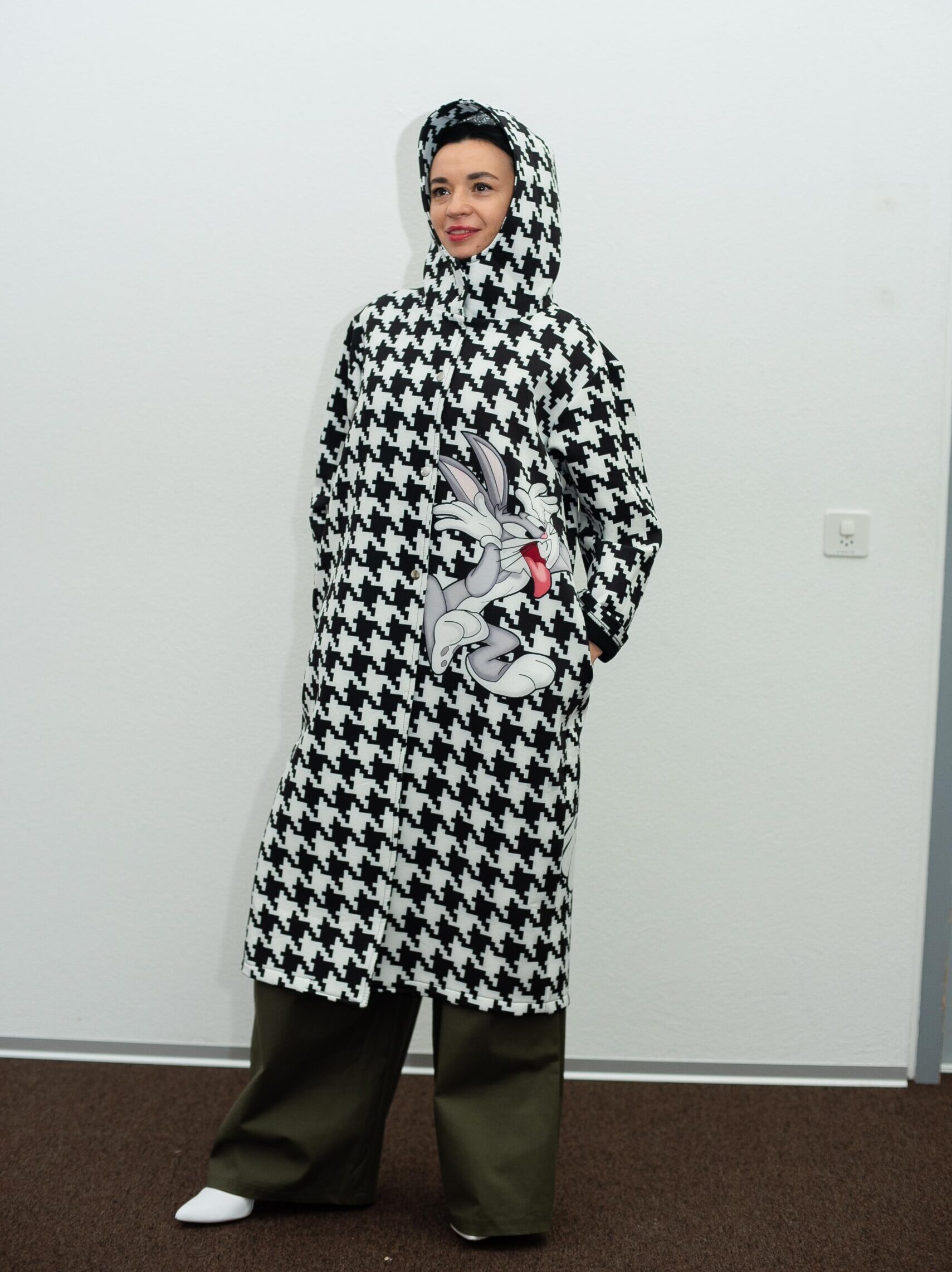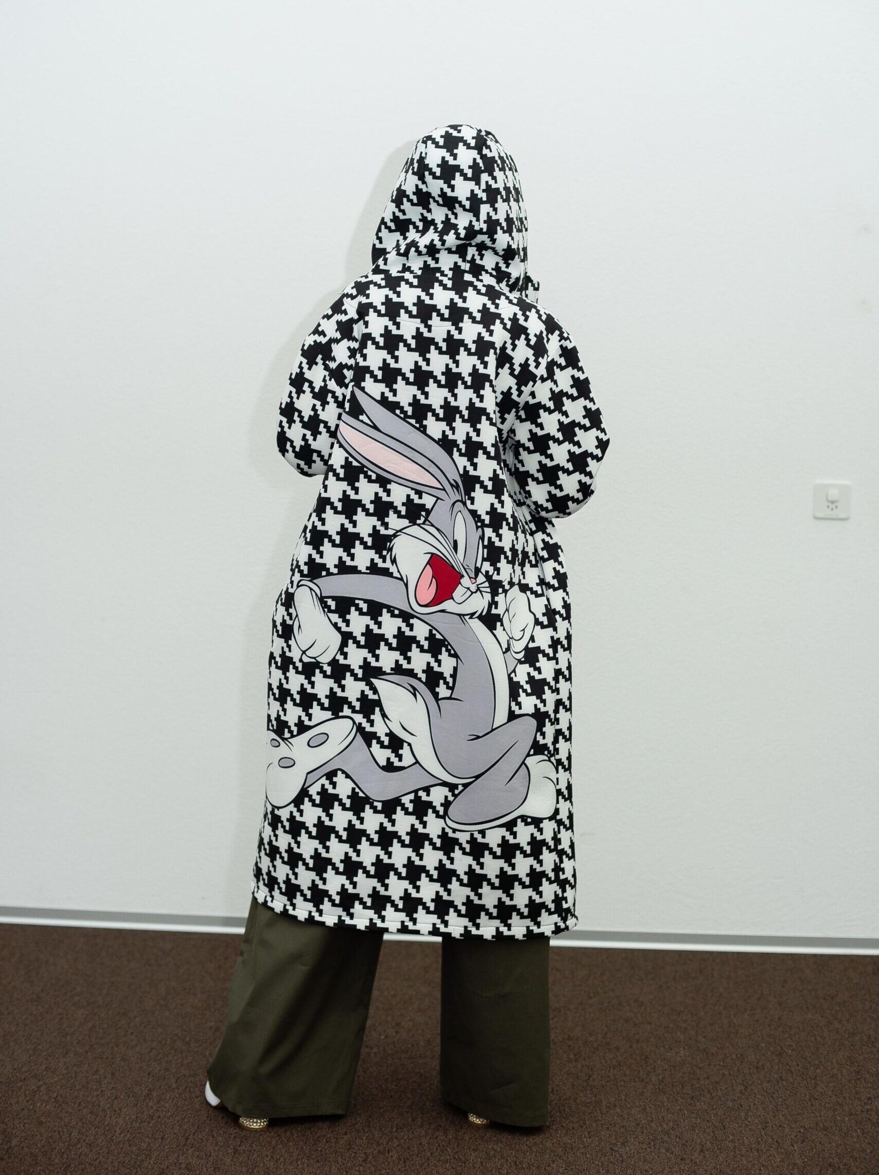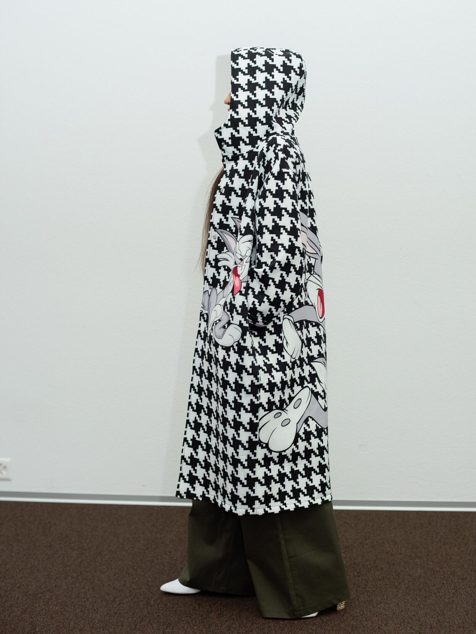Der Mantel Street Bunny überzeugt durch seine klare schwarz-weisse Farbgebung, ergänzt durch einen markanten grafischen Akzent auf der Rückseite. Der lange Schnitt und die Oversize-Passform verleihen dem Modell einen modernen Charakter und sorgen für eine lässige, zugleich ausgewogene Silhouette. Ideal für alle, die klassische Muster mit urbanem Stil kombinieren möchten.